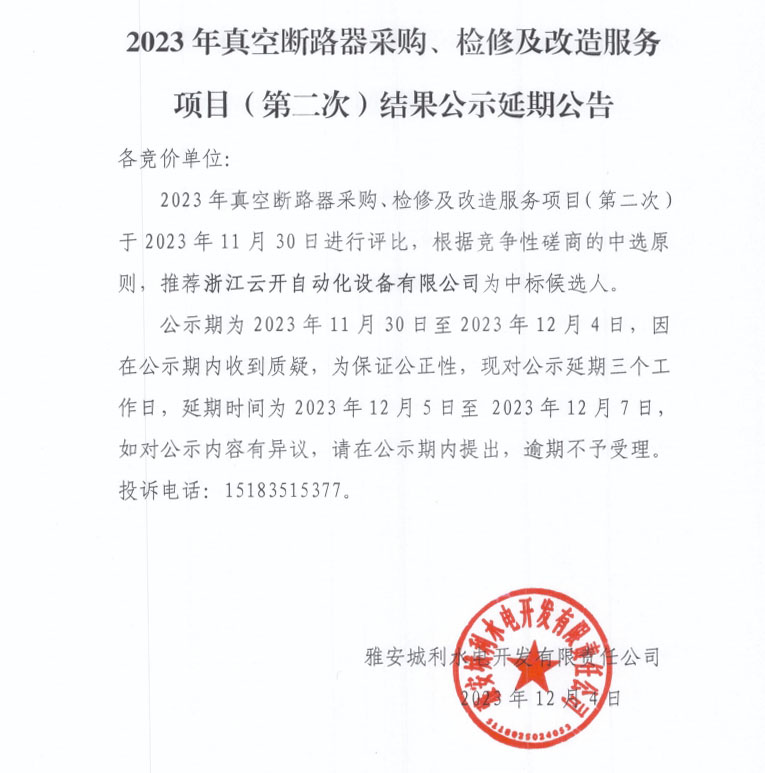 2023年真空斷路器采購、檢修及改造服務(wù)項(xiàng)目(第二次)結(jié)果公示延期公告