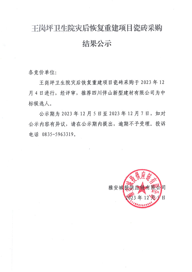 王崗坪衛(wèi)生院災(zāi)后恢復重建項目瓷磚采購結(jié)果公示