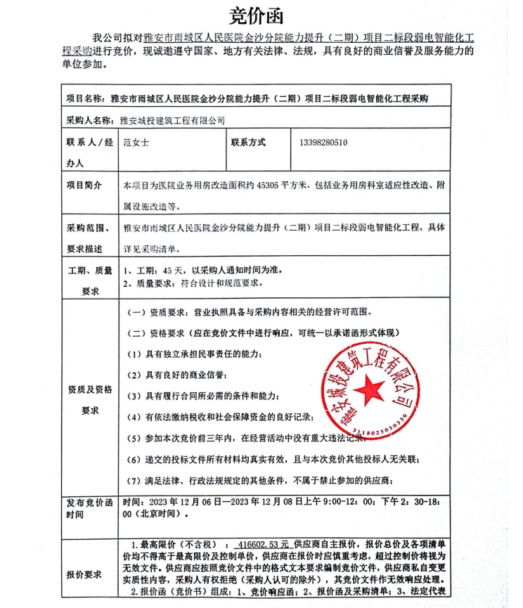 雅安市雨城區(qū)人民醫(yī)院金沙分院能力提升(二期)項(xiàng)目二標(biāo)段弱電智能化工程采購競(jìng)價(jià)公告