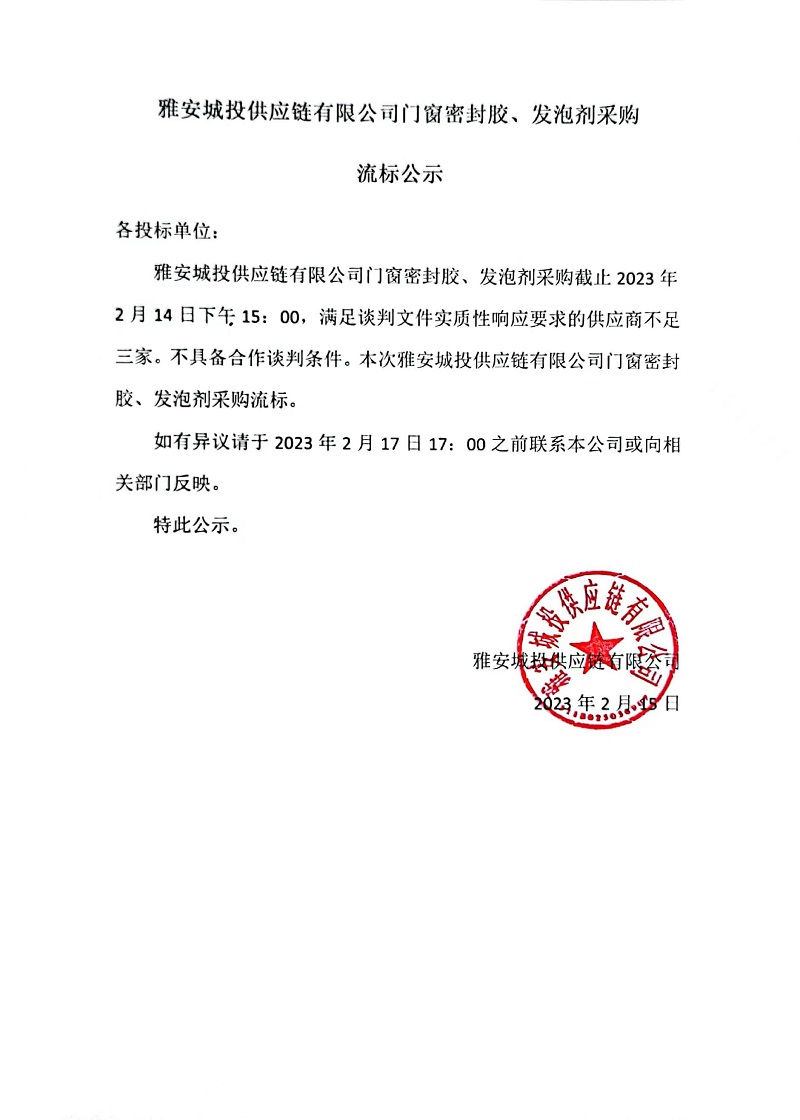 雅安城投供應鏈有限公司門窗密封膠、發(fā)泡劑采購流標公示