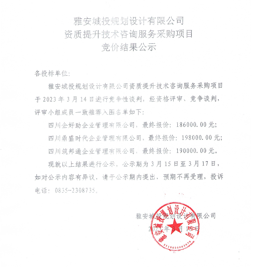 雅安城投規(guī)劃設(shè)計有限公司資質(zhì)提升技術(shù)咨詢服務(wù)采購項目競價結(jié)果公示
