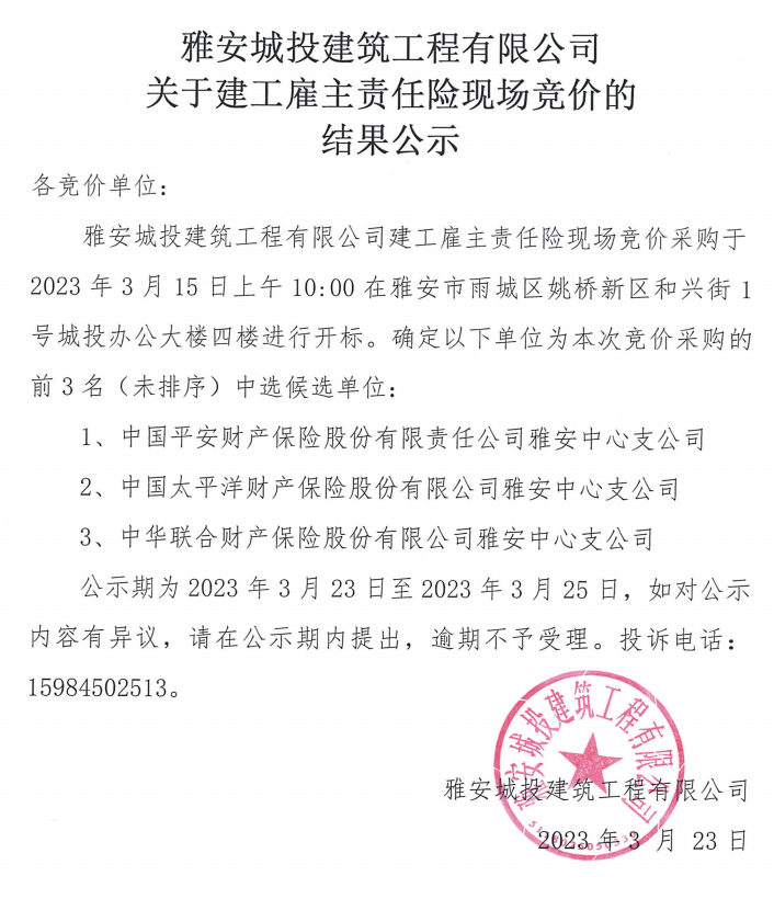雅安城投建筑工程有限公司關(guān)于建工雇主責任險現(xiàn)場競價的結(jié)果公示