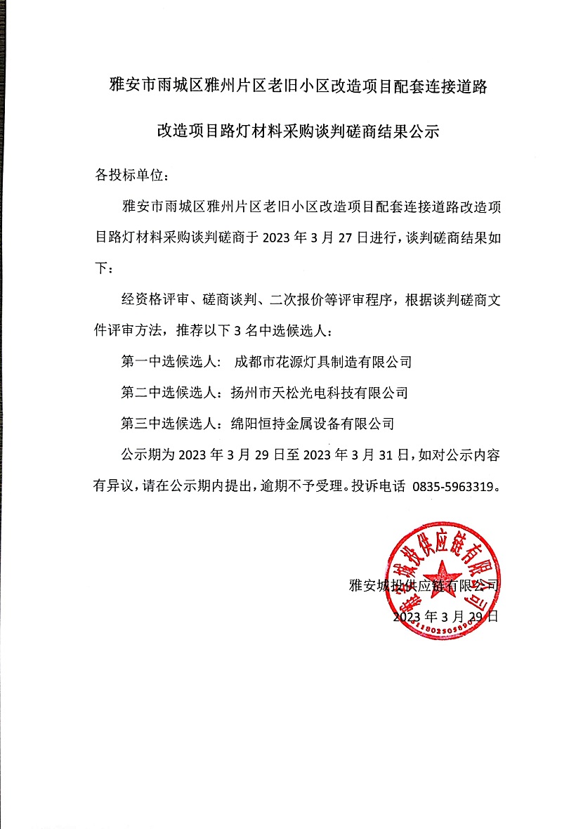 雅安市雨城區(qū)雅州片區(qū)老舊小區(qū)改造項(xiàng)目配套連接道路改造項(xiàng)目路燈材料采購(gòu)談判磋商結(jié)果公示
