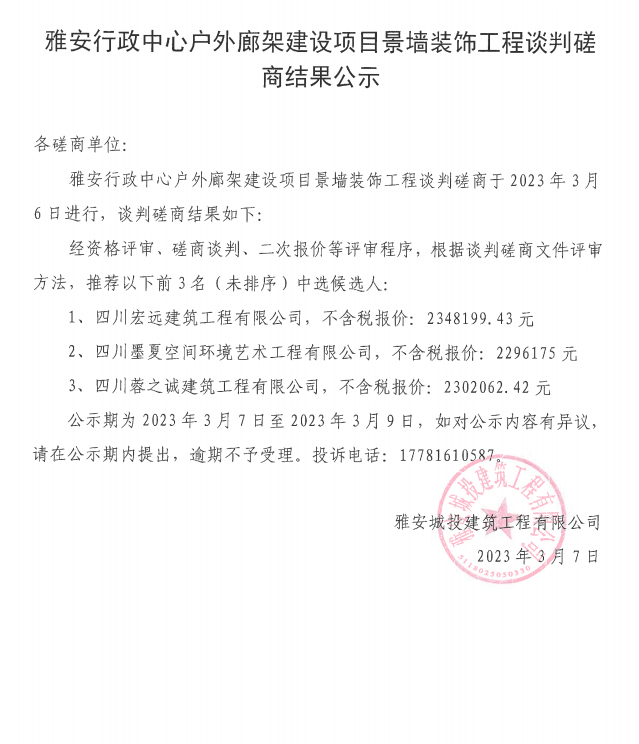 雅安行政中心戶(hù)外廊架建設(shè)項(xiàng)目景墻裝飾工程談判磋商結(jié)果公示