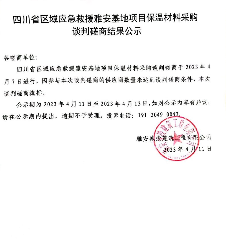 四川省區(qū)域應(yīng)急救援雅安基地項目保溫材料采購談判磋商結(jié)果公示