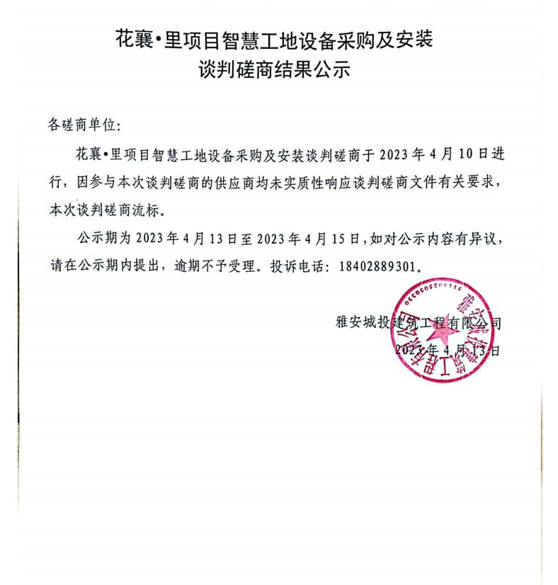 花襄·里項目智慧工地設采購備及安裝談判磋商結(jié)果公示