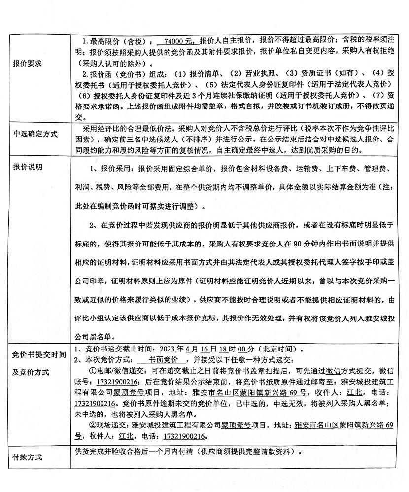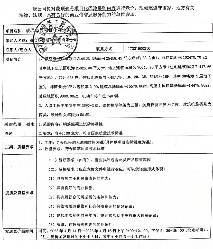蒙頂壹號項目化糞池競價公告