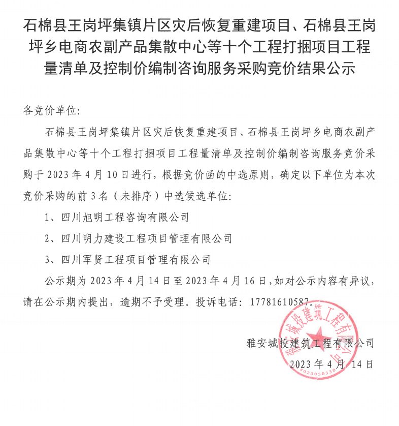 石棉縣王崗坪集鎮(zhèn)片區(qū)災后恢復重建項目、石棉縣王崗坪鄉(xiāng)電商農(nóng)副產(chǎn)品集散中心等十個工程打捆項目工程量清單及控制價編制咨詢服務采購競價結果公示