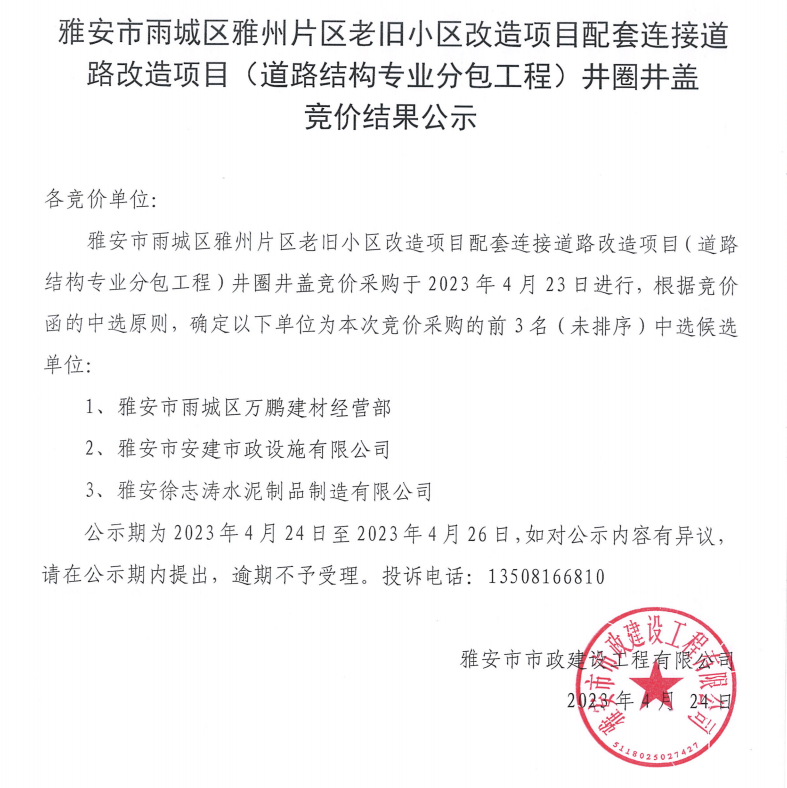 雅安市雨城區(qū)雅州片區(qū)老舊小區(qū)改造項(xiàng)目配套連接道路改造項(xiàng)目(道路結(jié)構(gòu)專(zhuān)業(yè)分包工程)井圈井蓋競(jìng)價(jià)結(jié)果公示