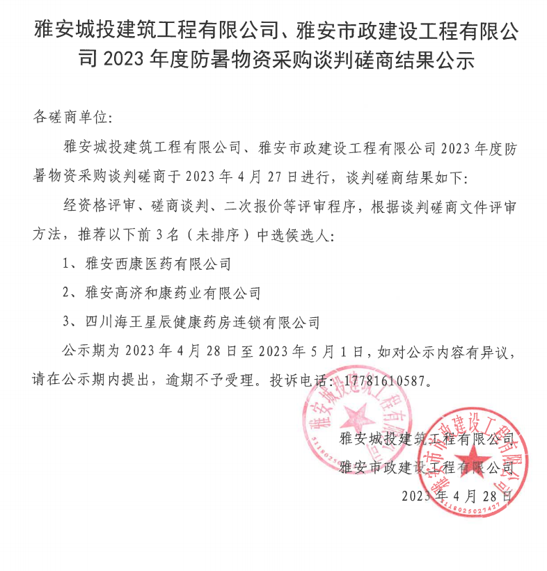 雅安城投建筑工程有限公司、雅安市政建設(shè)工程有限公司2023年度防暑物資采購(gòu)談判磋商結(jié)果公示