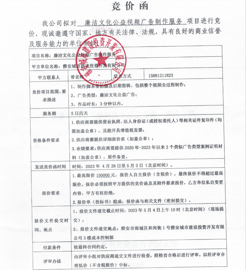 廉潔文化公益視頻廣告制作服務(wù)競價(jià)公告