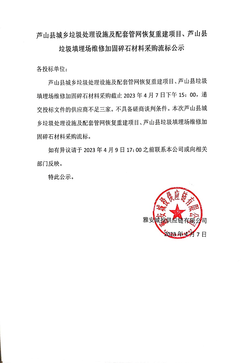 蘆山縣城鄉(xiāng)垃圾處理設(shè)施及配套管網(wǎng)恢復(fù)重建項目、蘆山縣垃圾填埋場維修加固碎石材料采購流標(biāo)公示