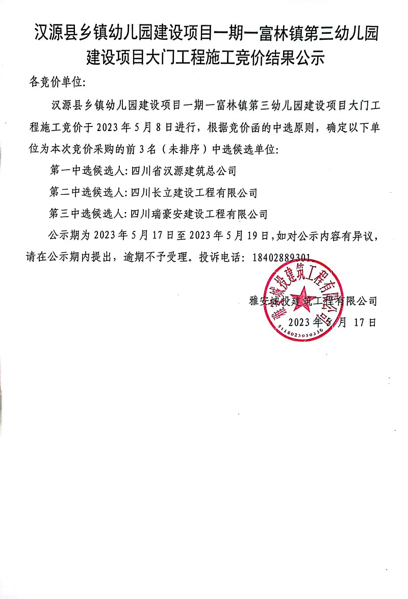 漢源縣鄉(xiāng)鎮(zhèn)幼兒園建設(shè)項(xiàng)目一期一富林鎮(zhèn)第三幼兒園建設(shè)項(xiàng)目大門工程施工競(jìng)價(jià)結(jié)果公示