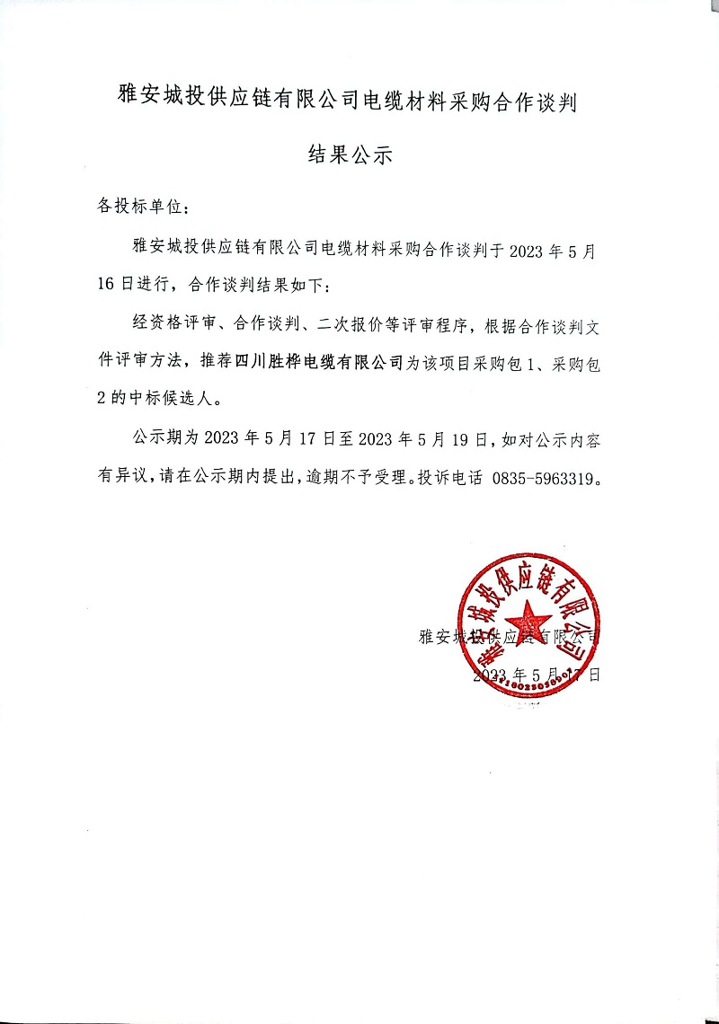 雅安城投供應鏈有限公司電纜材料采購合作談判結果公示