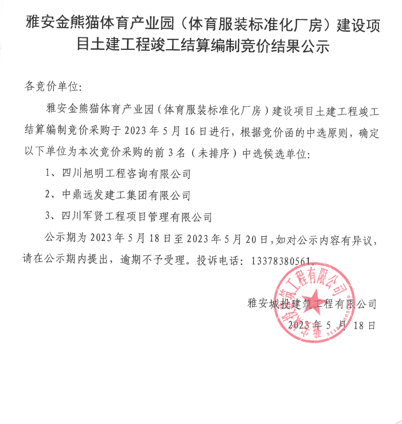 雅安金熊貓?bào)w育產(chǎn)業(yè)園(體育服裝標(biāo)準(zhǔn)化廠房)建設(shè)項(xiàng)目土建工程竣工結(jié)算編制競(jìng)價(jià)結(jié)果公示