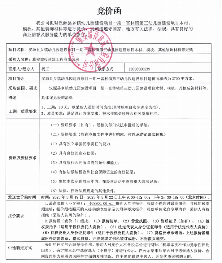 漢源縣鄉(xiāng)鎮(zhèn)幼兒園建設(shè)項(xiàng)目一期一富林鎮(zhèn)第三幼兒園建設(shè)項(xiàng)目木材、模板、其他裝飾材料等采購競價公告