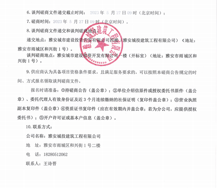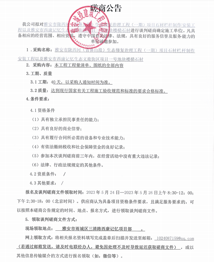 雅安市隴西河(青鼻山段)生態(tài)修復治理工程(一期)項目石材欄桿制作安裝工程以及雅安市西康記憶生態(tài)文旅街區(qū)項目一號地塊樓梯石材談判磋商公告