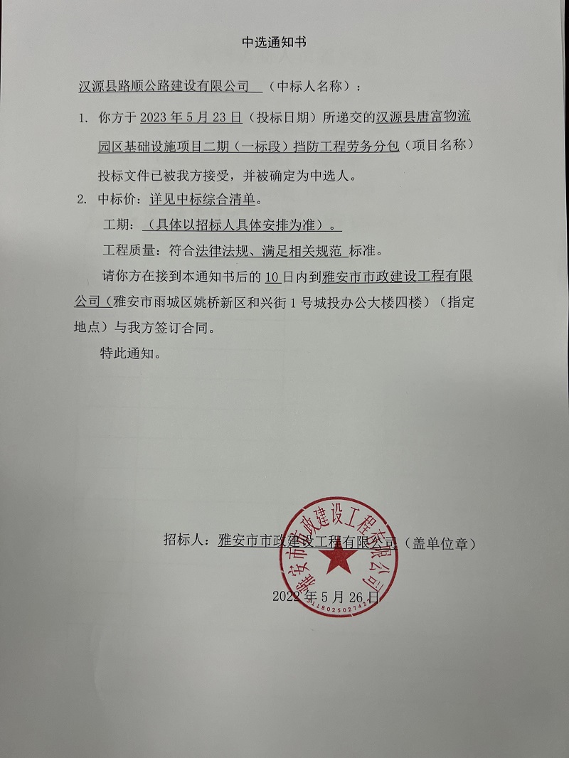 漢源縣唐富物流園區(qū)基礎(chǔ)設施項目二期(一標段)擋防工程勞務分包中選通知書