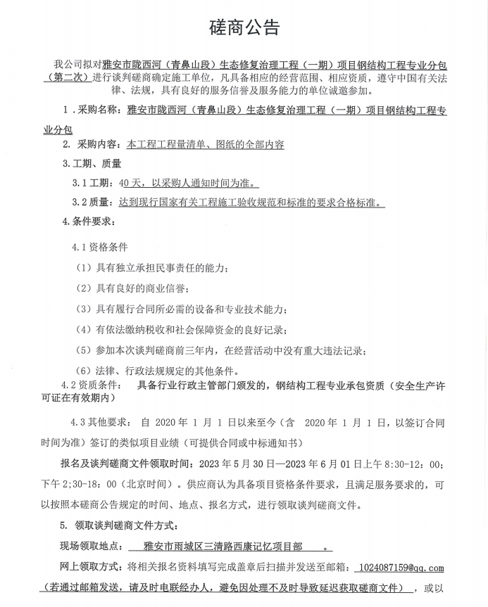 雅安市隴西河(青鼻山段)生態(tài)修復(fù)治理工程(一期)項(xiàng)目鋼結(jié)構(gòu)工程專業(yè)分包(第二次)談判磋商公告