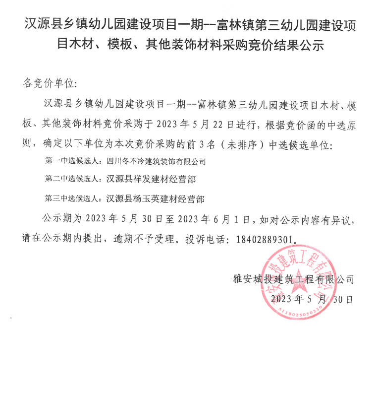 漢源縣鄉(xiāng)鎮(zhèn)幼兒園建設(shè)項(xiàng)目一期--富林鎮(zhèn)第三幼兒園建設(shè)項(xiàng)目木材、模板、其他裝飾材料采購競價結(jié)果公示