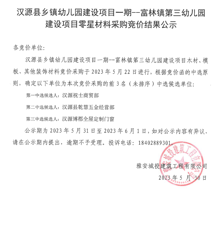 漢源縣鄉(xiāng)鎮(zhèn)幼兒園建設(shè)項(xiàng)目一期--富林鎮(zhèn)第三幼兒園建設(shè)項(xiàng)目零星材料采購競(jìng)價(jià)結(jié)果公示