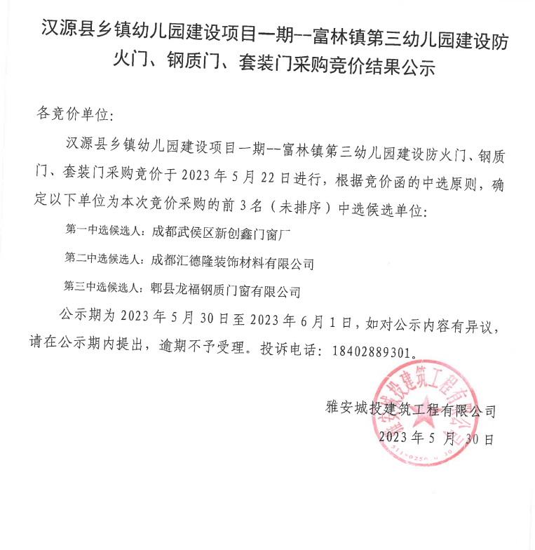 漢源縣鄉(xiāng)鎮(zhèn)幼兒園建設(shè)項(xiàng)目一期--富林鎮(zhèn)第三幼兒園建設(shè)防火門、鋼質(zhì)門、套裝門采購(gòu)競(jìng)價(jià)結(jié)果公示