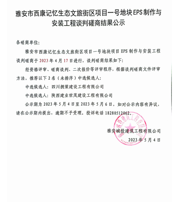 雅安市西康記憶生態(tài)文旅雅安市西康記憶生態(tài)文旅街區(qū)項(xiàng)目一號(hào)地塊EPS制作與安裝工程談判磋商結(jié)果公示