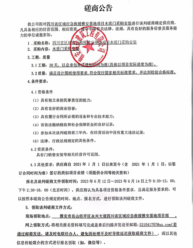 四川省區(qū)域應急救援雅安基地項目木質(zhì)門采購安裝談判磋商公告