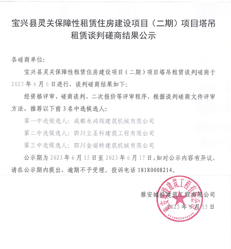 寶興縣靈關(guān)保障性租賃住房建設(shè)項(xiàng)目(二期)項(xiàng)目塔吊租賃談判磋商競價結(jié)果公示