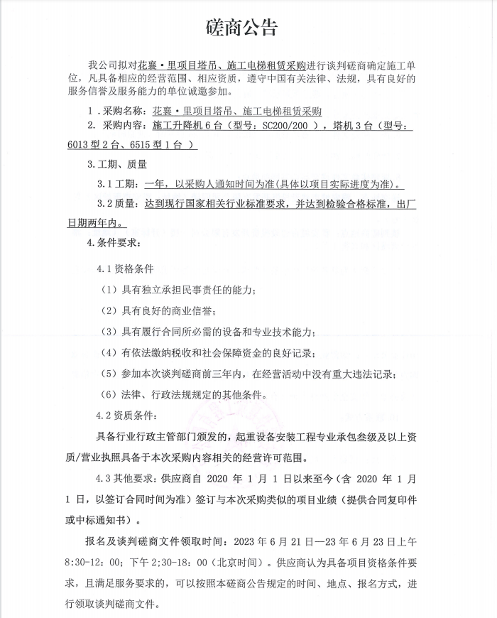 花襄·里項(xiàng)目塔吊、施工電梯租賃采購(gòu)談判磋商公告