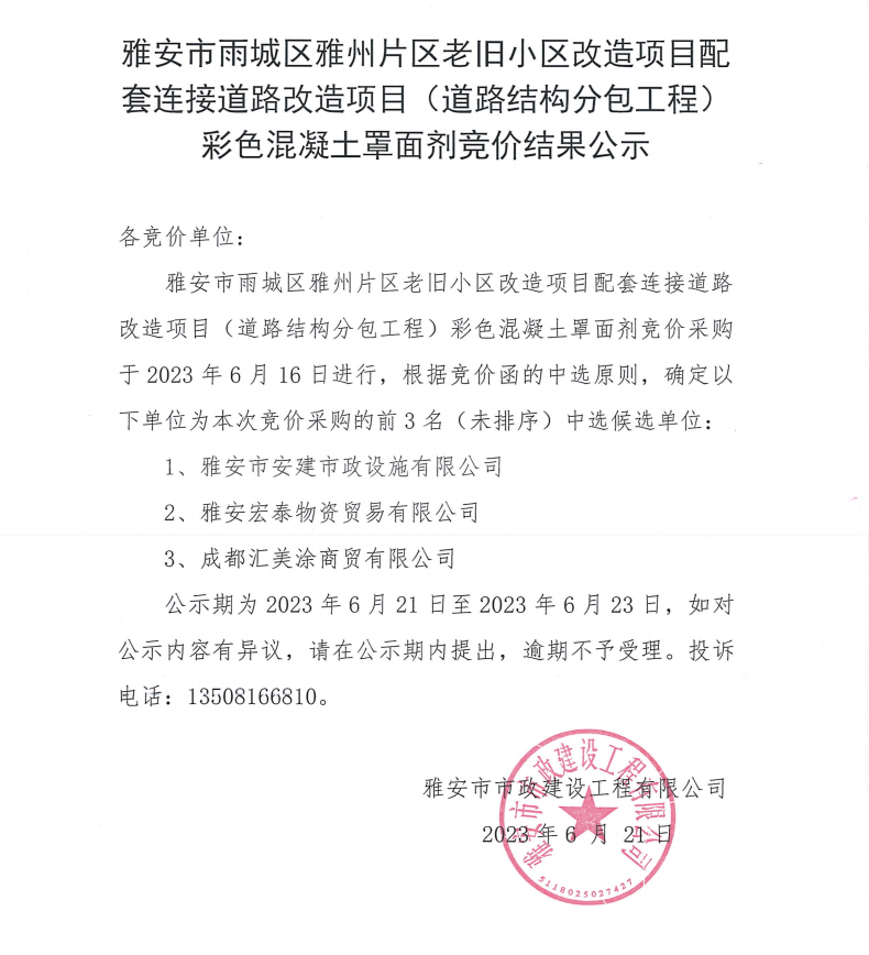 雅安市雨城區(qū)雅州片區(qū)老舊小區(qū)改造項(xiàng)目配套連接道路改造項(xiàng)目(道路結(jié)構(gòu)專業(yè)分包工程)彩色混凝土罩面劑競價結(jié)果公示