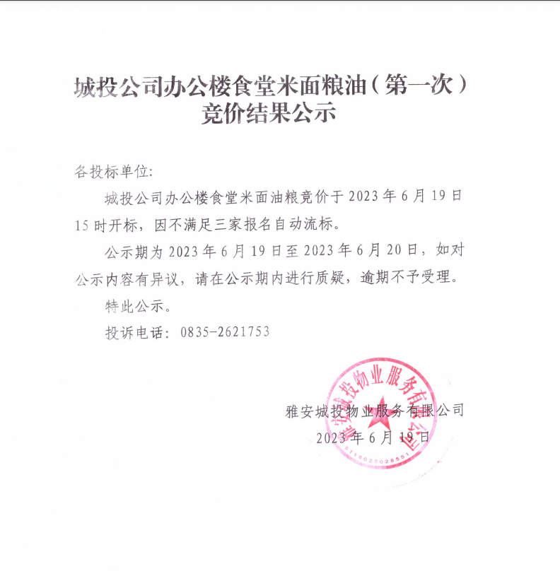 城投公司辦公樓食堂米面糧油(第一次)競價結果公示