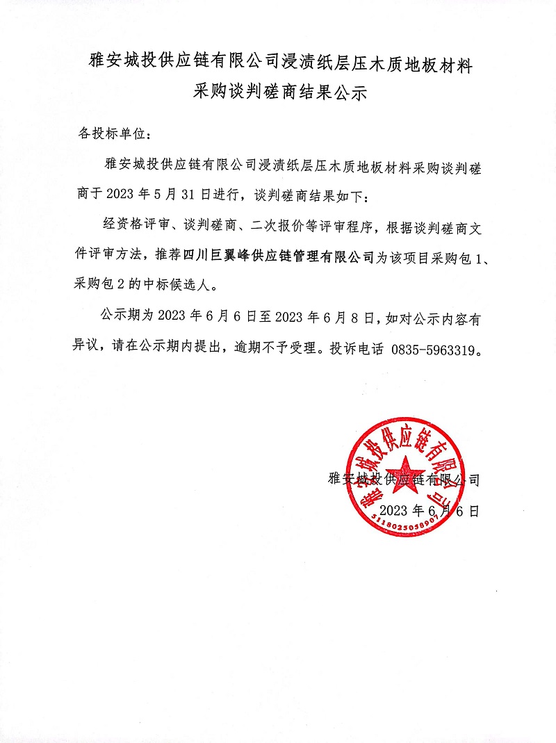 雅安城投供應(yīng)鏈有限公司浸漬紙層壓木質(zhì)地板材料采購(gòu)談判磋商結(jié)果公示