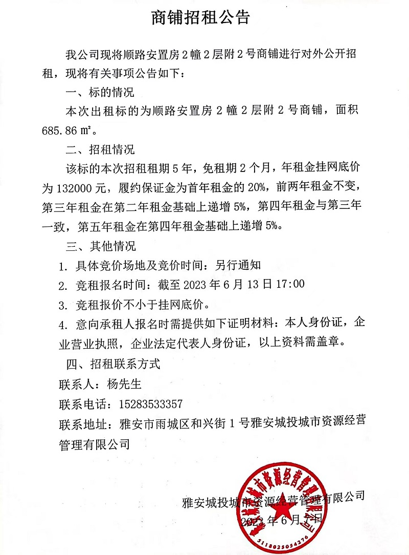 順路安置房2幢2層附2號商鋪招租公告