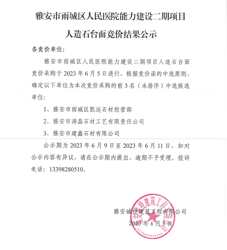 雅安市雨城區(qū)人民醫(yī)院能力建設(shè)二期項(xiàng)目人造石臺(tái)面競(jìng)價(jià)結(jié)果公示