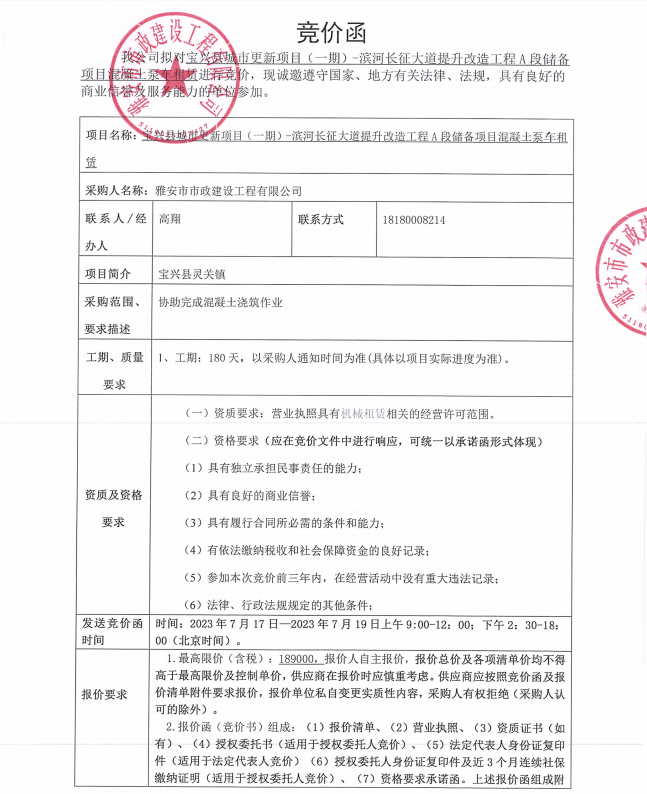 寶興縣城市更新項(xiàng)目(一期)-濱河長征大道提升改造工程A段儲備項(xiàng)目混凝土泵車租賃競價(jià)公告