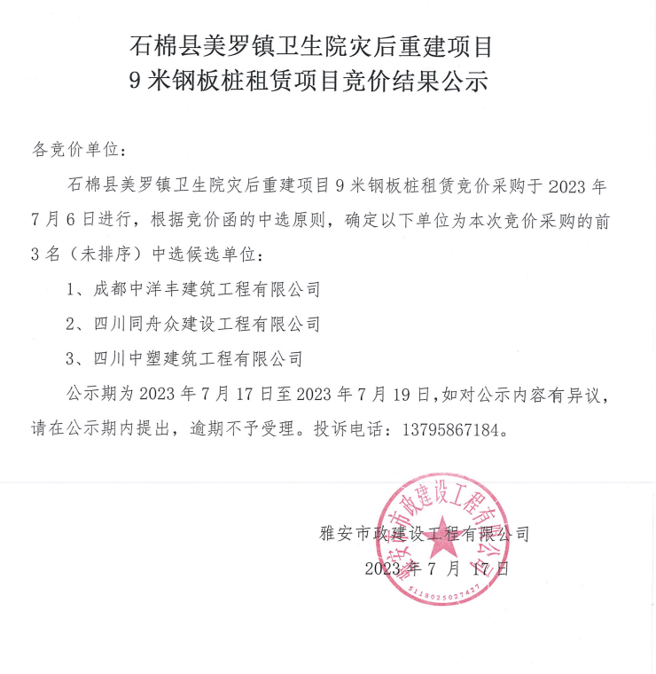 石棉縣美羅鎮(zhèn)衛(wèi)生院災后重建項目9米鋼板樁租賃項目競價結(jié)果公示