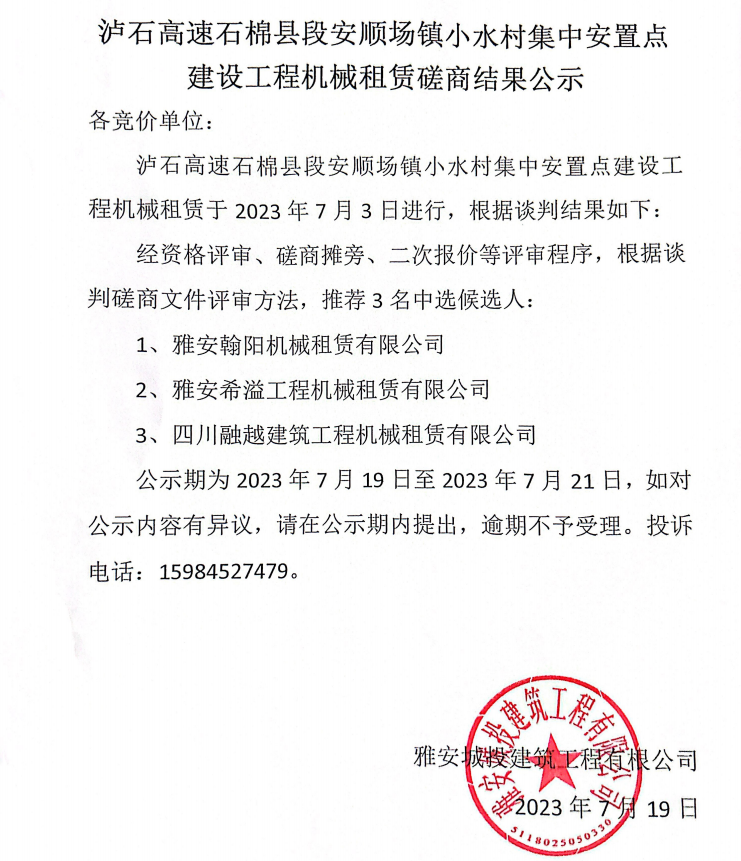 瀘石高速石棉縣段安順場鎮(zhèn)小水村集中安置點(diǎn)建設(shè)工程機(jī)械租賃談判磋商結(jié)果公示