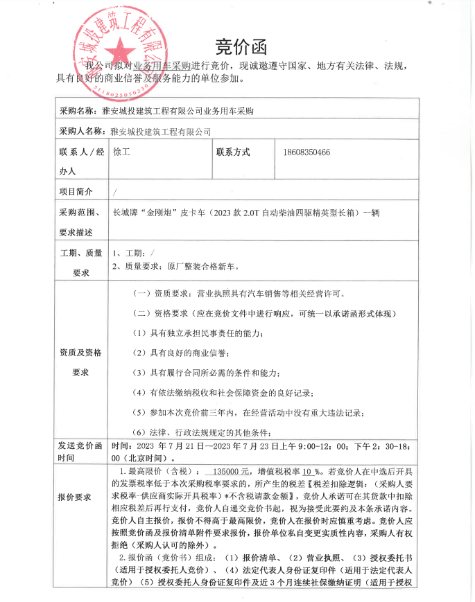雅安城投建筑工程有限公司業(yè)務(wù)用車(chē)采購(gòu)競(jìng)價(jià)公告