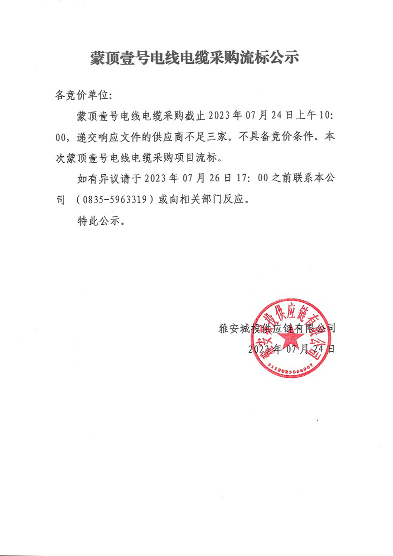 蒙頂壹號(hào)電線電纜采購(gòu)流標(biāo)公示