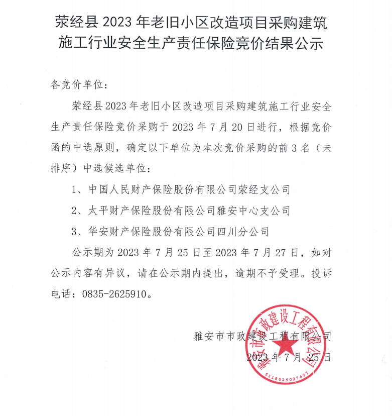 滎經(jīng)縣2023年老舊小區(qū)改造項(xiàng)目采購(gòu)建筑施工行業(yè)安全生產(chǎn)責(zé)任保險(xiǎn)競(jìng)價(jià)結(jié)果公示