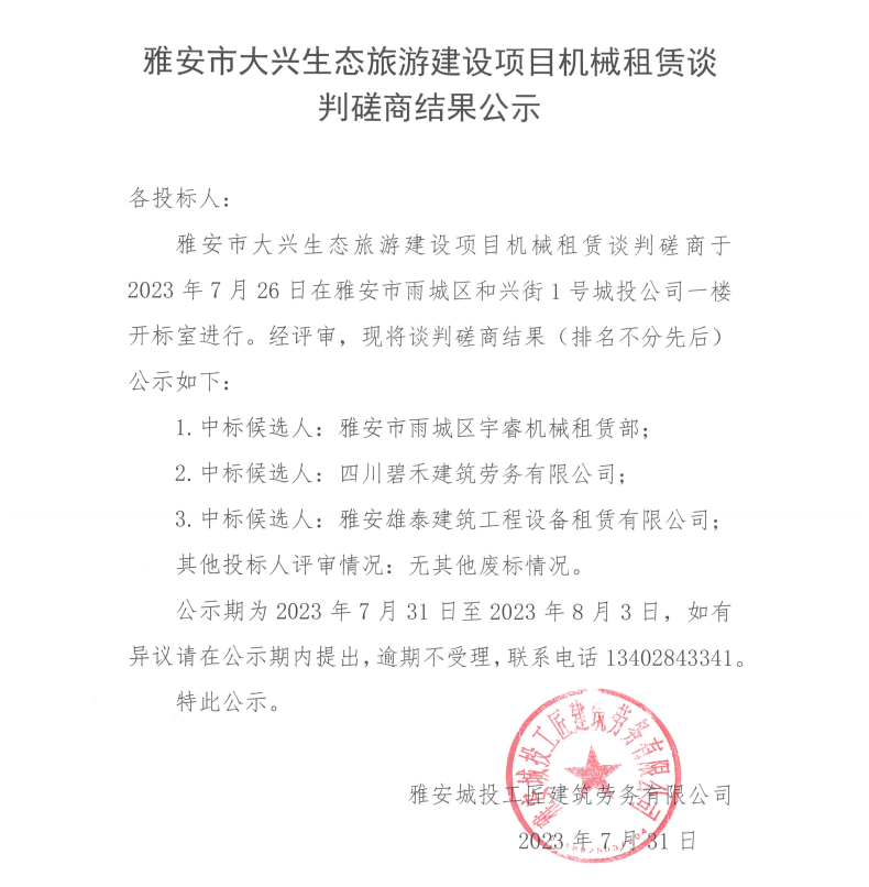 雅安市大興生態(tài)旅游建設項目機械租賃談判磋商結(jié)果公示