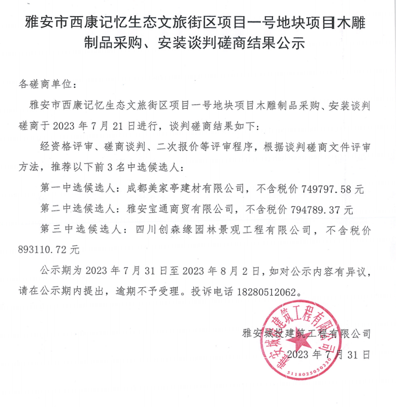 雅安市西康記憶生態(tài)文旅街區(qū)項目一號地塊項目木雕制品采購、安裝談判磋商結果公示