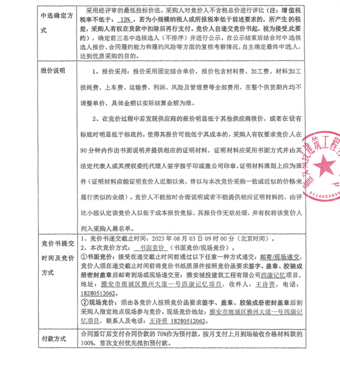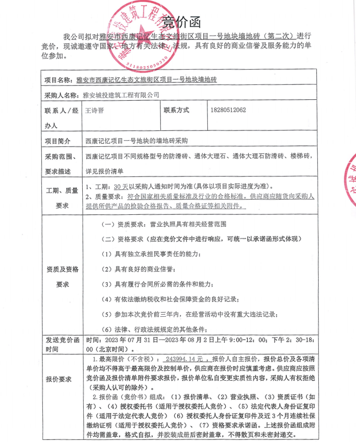 雅安市西康記憶生態(tài)文旅街區(qū)項(xiàng)目一號(hào)地塊墻地磚(第二次)競(jìng)價(jià)采購公告