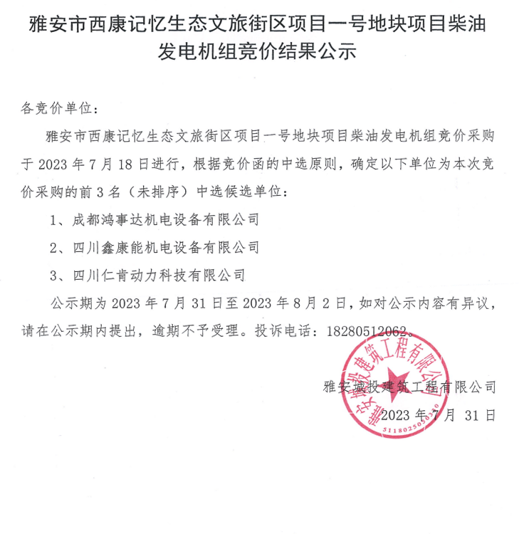 雅安市西康記憶生態(tài)文旅街區(qū)項(xiàng)目一號(hào)地塊項(xiàng)目柴油發(fā)電機(jī)組競價(jià)結(jié)果公示