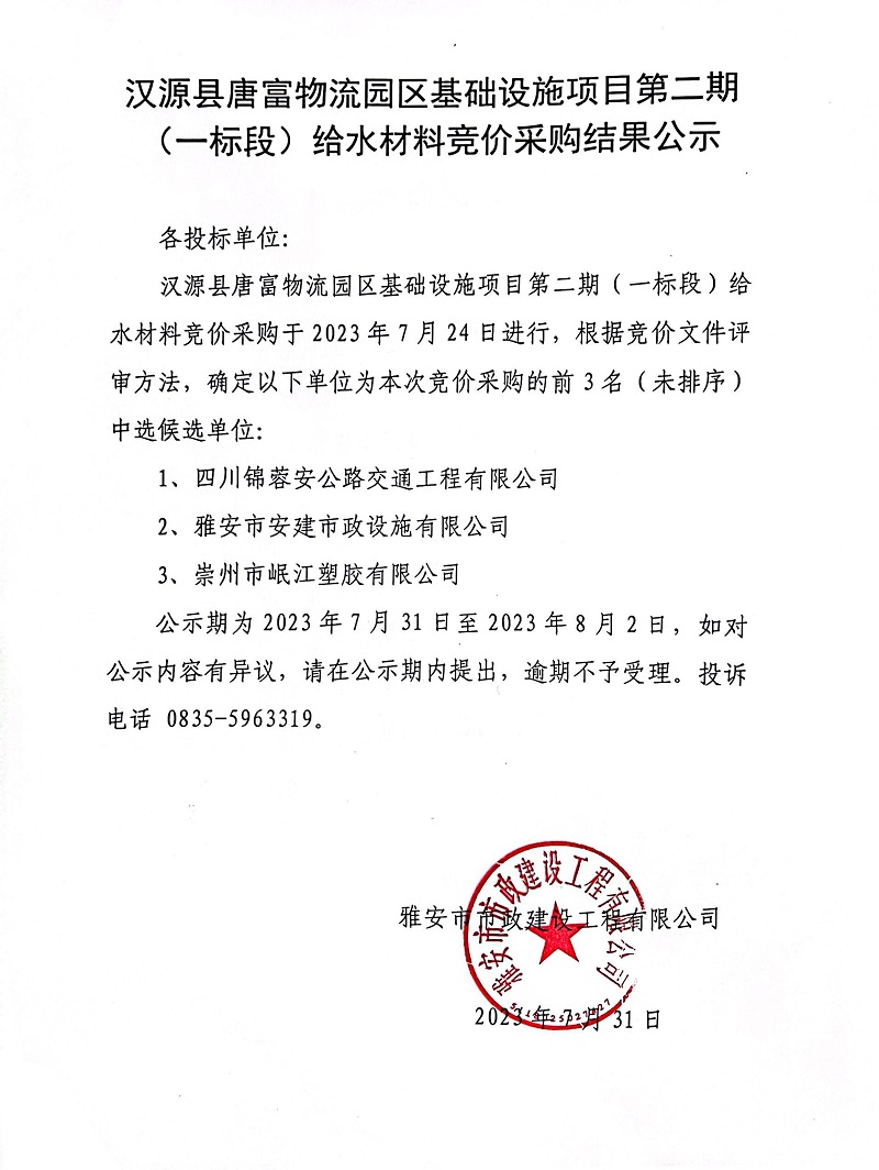 漢源縣唐富物流園區(qū)基礎(chǔ)設(shè)施項(xiàng)目第二期(一標(biāo)段)給水材料競價(jià)采購結(jié)果公示