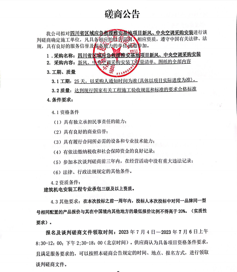 四川省區(qū)域應(yīng)急救援雅安基地項(xiàng)目新風(fēng)、中央空調(diào)采購(gòu)安裝談判磋商公告