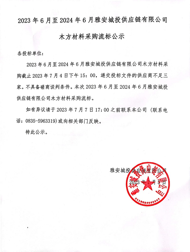2023年6月至2024年6月雅安城投供應(yīng)鏈有限公司木方材料采購(gòu)流標(biāo)公示