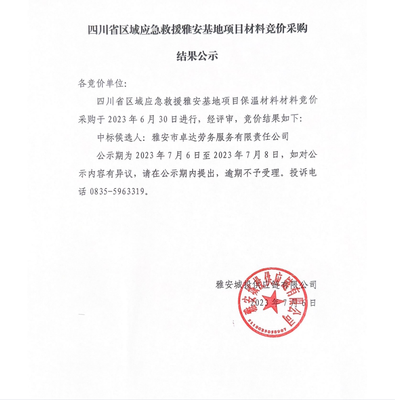 四川省區(qū)域應(yīng)急救援雅安基地項(xiàng)目材料競價(jià)采購結(jié)果公示