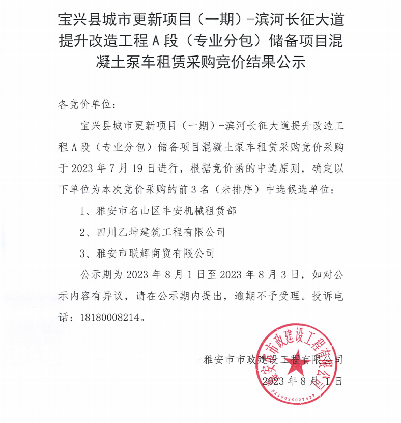寶興縣城市更新項(xiàng)目(一期)-濱河長征大道提升改造工程A段(專業(yè)分包)儲備項(xiàng)目混凝土泵車租賃采購競價(jià)結(jié)果公示